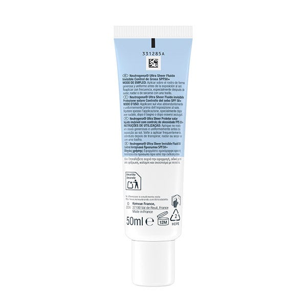 Neutrogena Ultra Sheer Fluido Invisible Oil Control SPF50+ (50 ml) es un protector solar facial con protección de amplio espectro, diseñado para pieles grasas o con tendencia acneica, de textura liviana y resistente al agua.
