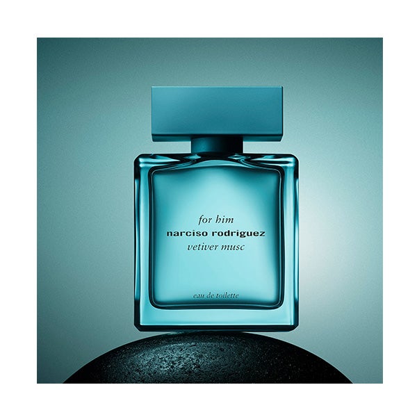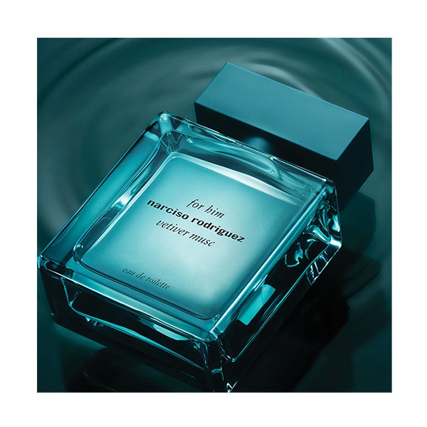 Para acompañar esta fragancia, el frasco de for him vetiver musc adopta un tono verde agua translúcido inspirado en el entorno natural, evocando la pureza mineral de su composición.