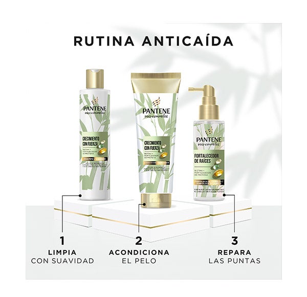 Crecimiento con Fuerza de uso diario: champú, acondicionador, crema sin aclarado y tratamiento capilar. ayuda a proteger el pelo frente al desgaste del peinado
