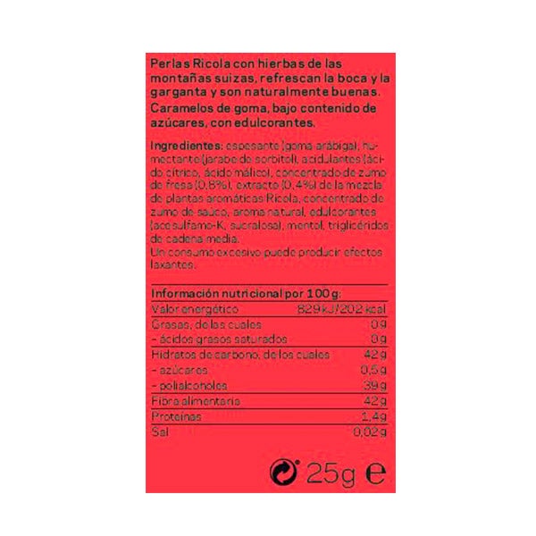 Espesante (goma arábica), humectante (jarabe de sorbitol), acidulantes (ácido cítrico, ácido málico), concentrado de zumo de fresa (0,8%), extracto (0,4%) de la mezcla de plantas aromáticas Ricola, concentrado de zumo de saúco, aroma natural, edulcorantes (acesulfamo-K sucralosa), mentol, triglicéridos de cadena media.