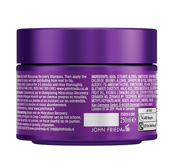 Después de lavar con el Champú Fortalecedor Miraculous Recovery, aplica la Mascarilla Fortalecedora Intensiva sobre el cabello húmedo, distribuyéndola uniformemente de la raíz hasta las puntas. Déjala actuar entre 3 y 5 minutos y enjuaga con abundante agua.