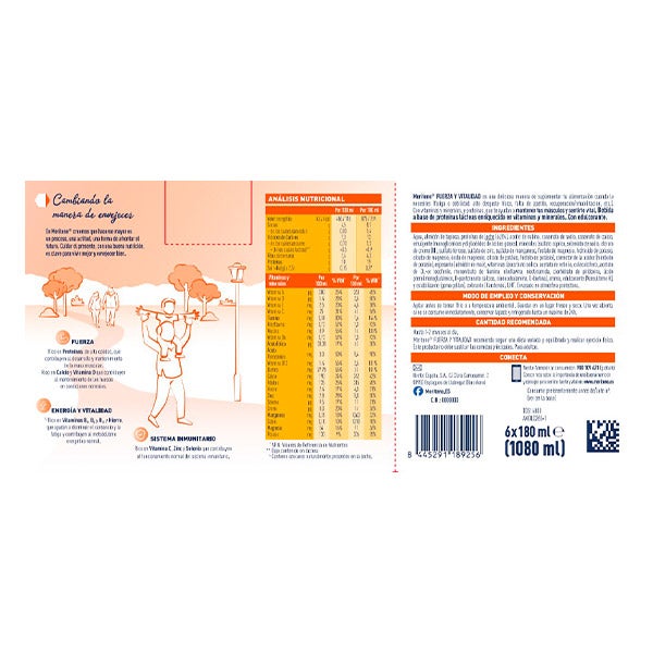 Meritene FUERZA Y VITALIDAD Pack 6 briks de 180 ml sabor Vainilla es una bebida nutricional lista para consumir. Su fórmula NutriPlus combina proteínas de alto valor biológico junto con vitaminas y minerales esenciales. Estos componentes ayudan a complementar la alimentación diaria, favoreciendo la reducción del cansancio y la fatiga y apoyando el correcto funcionamiento del sistema inmunitario.