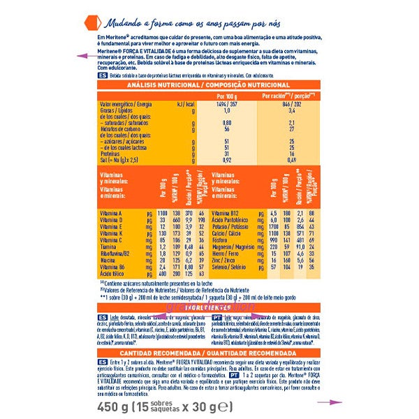 Meritene® FUERZA Y VITALIDAD aconseja mantener una alimentación equilibrada y variada junto con la práctica de actividad física. Este complemento no sustituye las comidas principales. Producto destinado a adultos.