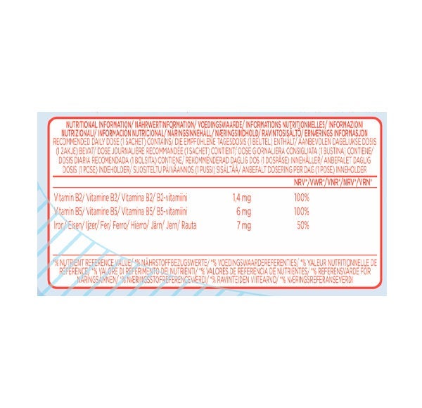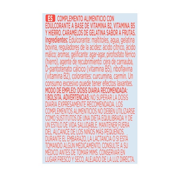 Complemento alimenticio con edulcorante a base de Vitamina B2, Vitamina B5 y Hierro, caramelos de Gelatina sabor a frutas
