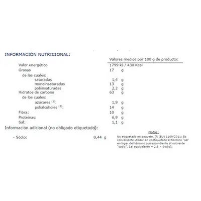 DECLARACIóN NUTRICIONAL: 0% azúcares añadidos; Alto en fibra; Integral