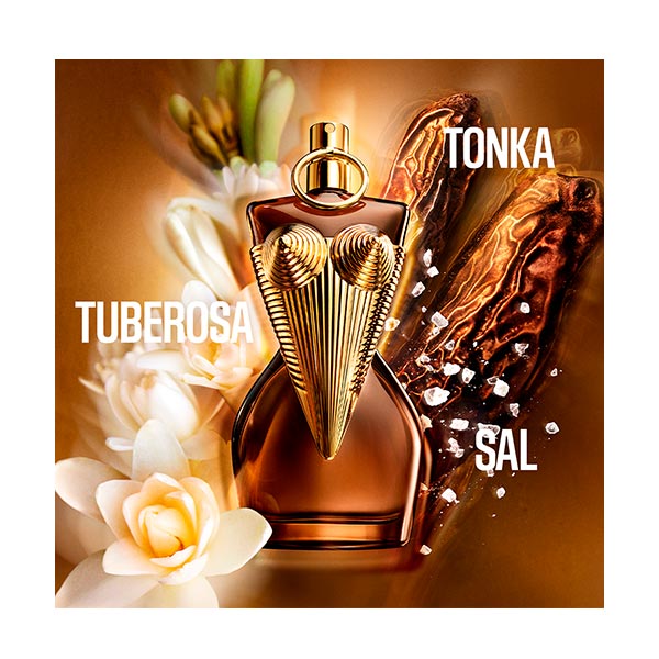 Gaultier Divine Elixir cautiva con la riqueza de su fragancia floral marina ambarina, presentada en un frasco que combina ámbar y destellos dorados. La intensidad de la haba tonka y la suavidad sensual de la tuberosa se liberan sin límites. Plenamente femenina, sin reservas. Intensamente auténtica. ¿Su ambición? Vivir en exceso. ¿Su universo? Ella lo crea a su medida. Bajo un corsé radiante, los reflejos de cristal centellean con osadía. Una joya perfumada, piel dorada y ambarina esculpida con lujo. Su poder resalta una feminidad arrebatadora que acapara todas las miradas. Ella marca el rumbo, y el mundo la sigue.