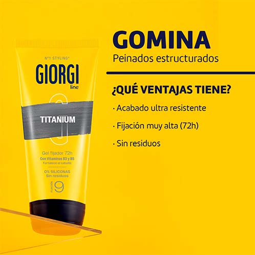 Descubre la Gomina Titanium de Giorgi, que ofrece una fijación extraordinaria y duradera, con una textura ligera adecuada para el uso diario.