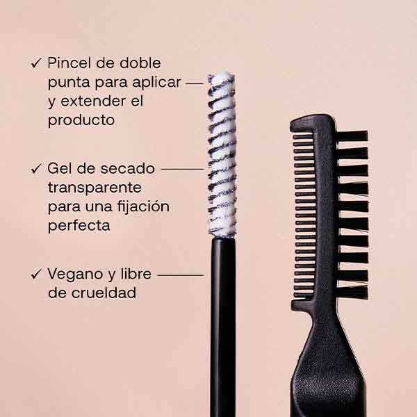 Incluye una brocha de doble extremo que permite aplicar el gel con precisión y peinar las cejas para conseguir la forma deseada.