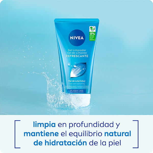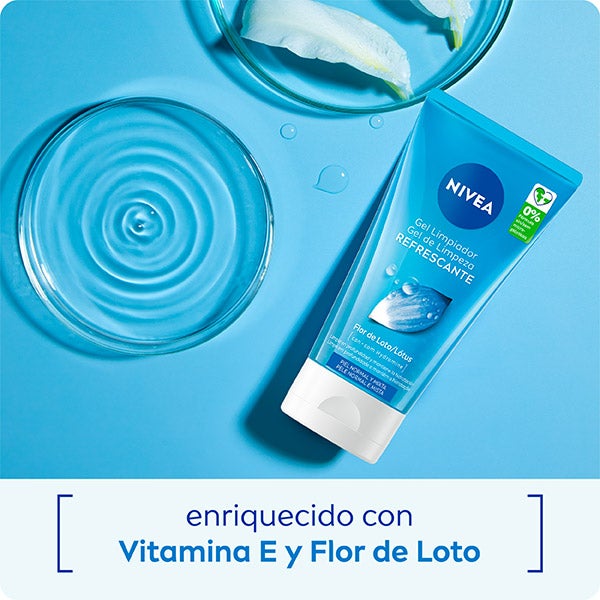 NIVEA Gel Limpiador Refrescante combina Flor de Loto, Vitamina E e Hydramine, un activo reconocido por su capacidad para mantener la piel hidratada. Diseñado especialmente para pieles normales y mixtas, limpia a fondo eliminando las impurezas del día a día, a la vez que tonifica y aporta una agradable sensación de frescor en cada aplicación.