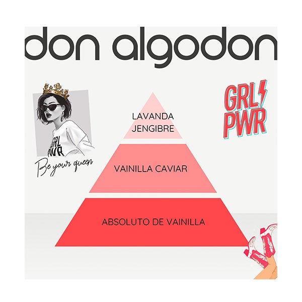 Siente la energía con la eau de toilette Girl Power de Don Algodón. Este perfume gourmand con matices avainillados de 30 ml combina lavanda, jengibre y vainilla caviar, pensado para mujeres auténticas y seguras de sí mismas. Ideal para resaltar la feminidad y proyectar una presencia llena de confianza.