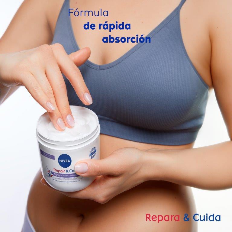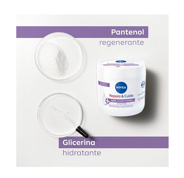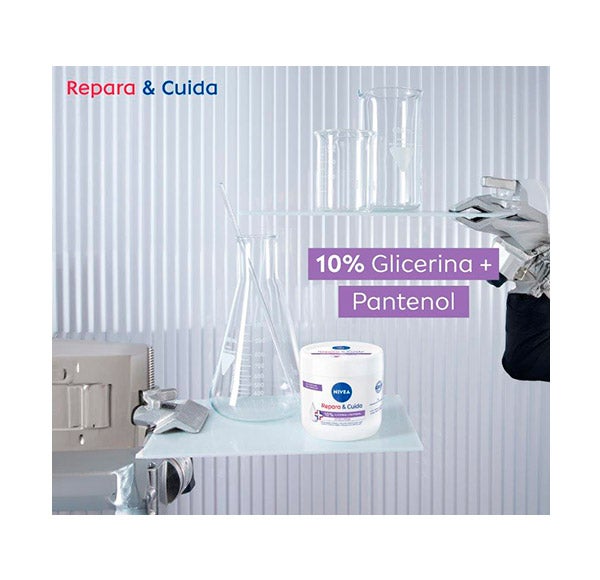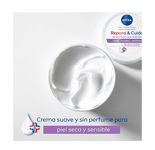 NIVEA Repara & Cuida Crema, formulada con un 10% de glicerina y pantenol, sin fragancia, ideal para piel seca y sensible. Su textura suave y efectiva contribuye a calmar la piel irritada y sensible, ofreciendo una sensación de alivio prolongada frente a la sequedad y manteniendo la hidratación hasta por 72 horas. Compatibilidad dermatológicamente comprobada.