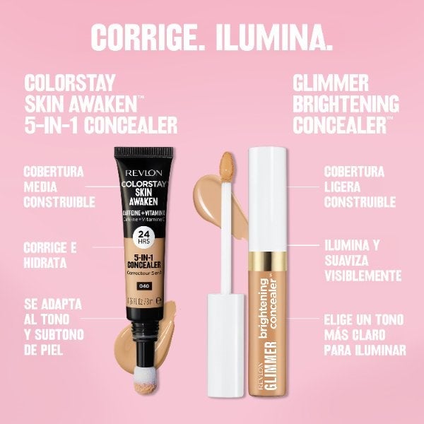 Corrige de inmediato e ilumina la piel con un acabado natural que permanece uniforme. Revlon Glimmer Concealer™ no solo disimula las ojeras, también aporta luminosidad al instante, equilibra el tono y suaviza la apariencia de las líneas de expresión, logrando una piel más lisa y tersa con el uso continuado. Su textura ligera se integra con facilidad, evita la acumulación en arrugas o líneas finas y se extiende de forma homogénea para un acabado natural y cómodo que dura hasta 24 horas.