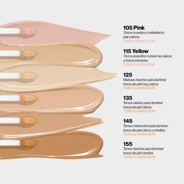 Disponible en 2 tonos correctores y 4 tonos iluminadores que se adaptan fácilmente a distintos tonos de piel y se difuminan sin esfuerzo.