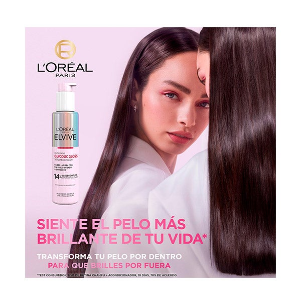 Elvive Glycolic Gloss de L’Oréal Paris es un tratamiento capilar con efecto laminado que transforma la rutina de cuidado del cabello en tan solo 5 minutos. Gracias a su textura cremosa con un 17% de Gloss Complex y ácido glicólico, penetra a fondo en la fibra capilar, cierra la cutícula y convierte el cabello apagado en una melena con un brillo tipo espejo. Perfecto para cabellos secos o porosos, ayuda a reparar el daño, mejora la suavidad y deja un acabado sedoso y con aspecto saludable. Su tecnología de laminado garantiza un efecto visible que se mantiene hasta 5 lavados, siendo el aliado ideal para lograr más luminosidad, suavidad y movimiento sin complicaciones.