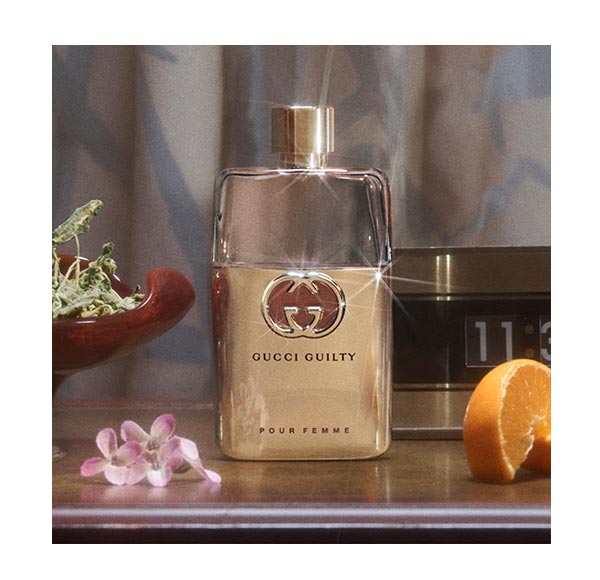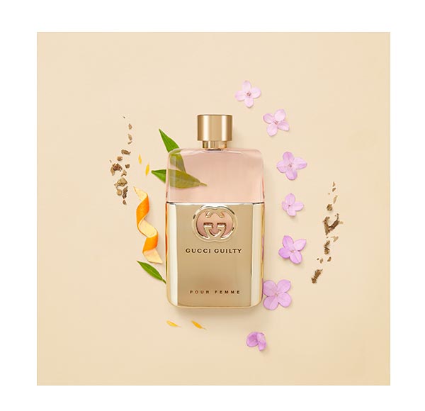 La esencia Gucci Guilty pour Femme se reinterpreta como un bouquet floral oriental que aporta profundidad y sofisticación al eau de toilette original.