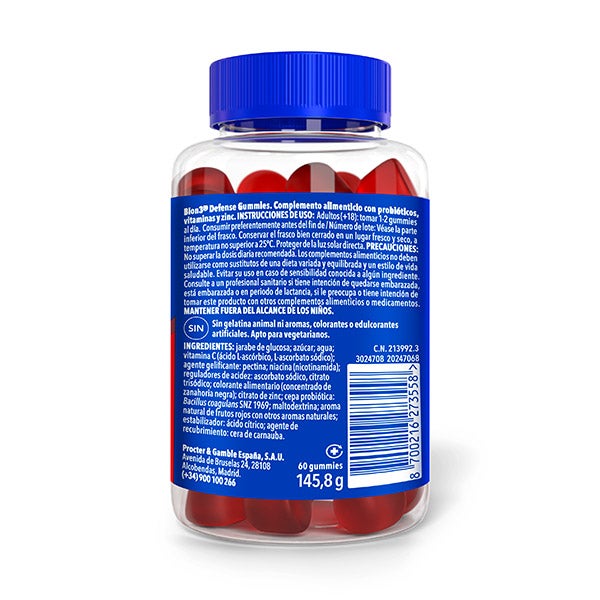 Jarabe De Glucosa; Azúcar; Agua; Vitamina C (Ácido L-Ascórbico; L-Ascorbato Sódico), Agente Gelificante: Pectina; Niacina (Nicotinamida), Reguladores De Acidez: Ascorbato Sódico; Citrato Trisódico; Colorante Alimentario (Concentrado De Zanahoria Negra); Citrato De Zinc, Cepa Probiótica: Bacillus Coagulans SNZ 1969; Maltodextrina; Aroma Natural De Frutos Rojos Con Otros Aromas Naturales, Estabilizador: Ácido Cítrico, Agente De Recubrimiento: Cera De Carnauba