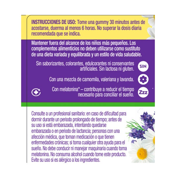 Ingredientes: jarabe de glucosa, azúcar, agua, gelatina (bovina), extracto de raíz de Valeriana officinalis L, regulador de acidez: ácido cítrico, saborizante natural, extracto de flor de Lavandula angustifolia Miller, extracto de flor de Matricaria chamomilla, antioxidante: E300, agente de recubrimiento: E903, clorhidrato de piridoxina, melatonina.