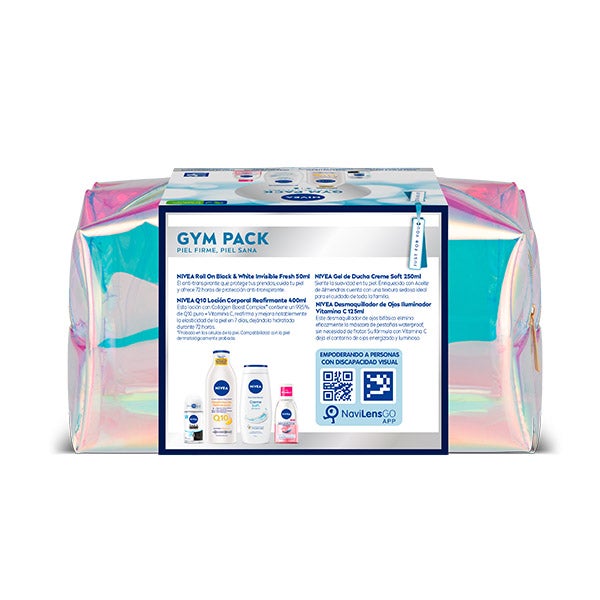 Este pack incluye una Nivea Q10 Loción Corporal Reafirmante, un Gel de Ducha Creme Care, un Desodorante Black & White Invisible Fresh Roll On y un Desmaquillador de Ojos Iluminador con Vitamina C.