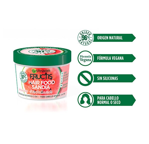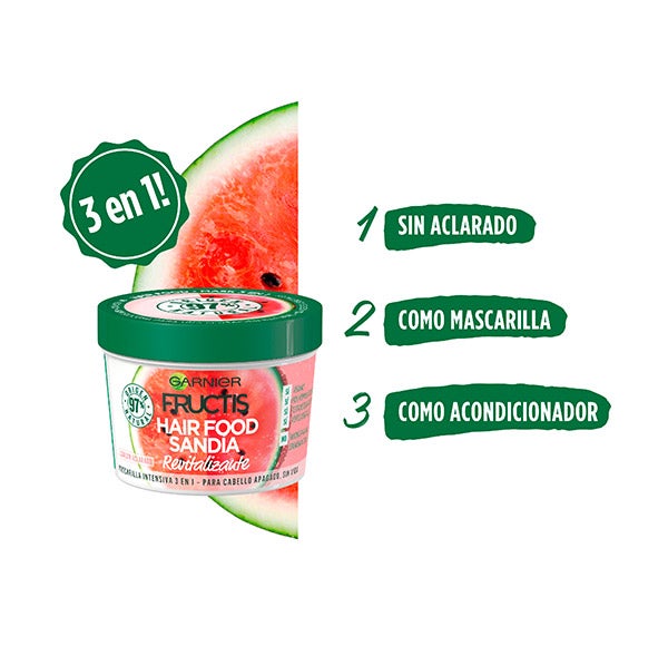 Experimenta la nueva mascarilla sin siliconas* Hair Food Sandía: la energía revitalizante de la sandía para despedirte del cabello opaco y sin movimiento. Formulada con extracto de sandía, este Hair Food está pensado para cuidar incluso los cabellos más exigentes. Su textura cremosa, ligera y apetecible está llena de componentes nutritivos e hidratantes, ofreciendo vitalidad y brillo a un pelo apagado que busca renacer.
