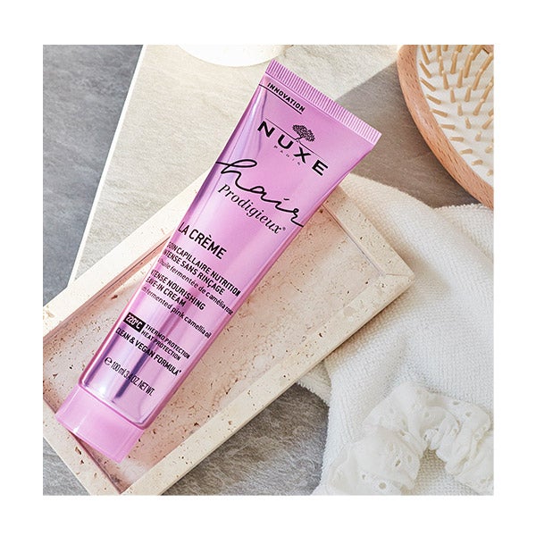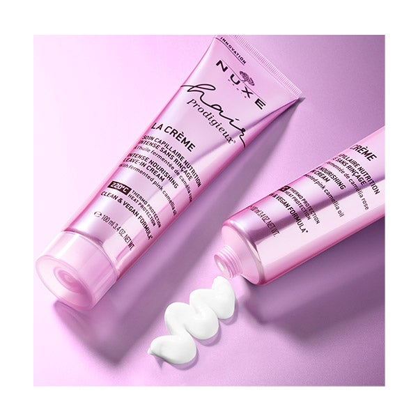 Envuelto en la fragancia emblemática de Huile Prodigieuse®, esta crema con protección térmica facilita el desenredado y resguarda la fibra capilar del calor de los dispositivos hasta 220°C/428°F.