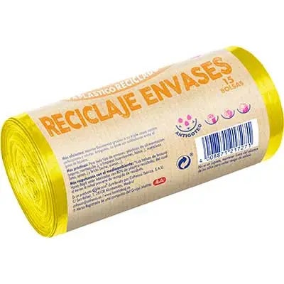 Bolsa Basura Handy Bag® especial reciclaje envases fabricada con 80% de material reciclado. Es una bolsa resistente y antigoteo, gracias a su triple capa contra perforaciones y roturas y a su base sin soldaduras que evita el goteo de líquidos.