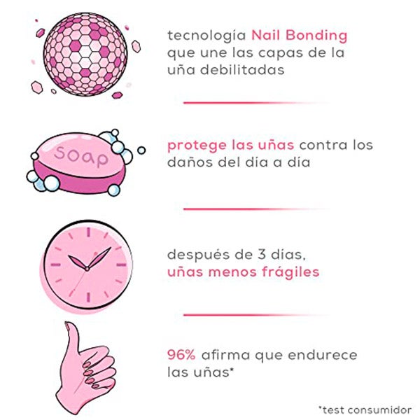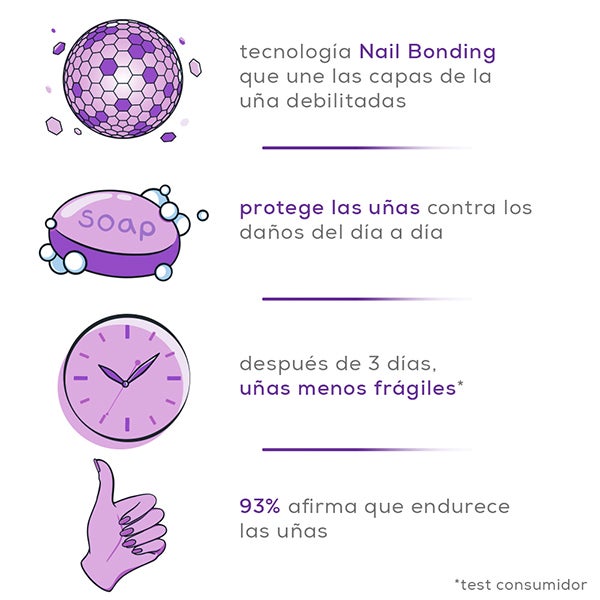 Su tecnología Nail Bonding contribuye a reforzar y cohesionar la superficie debilitada de cada uña.