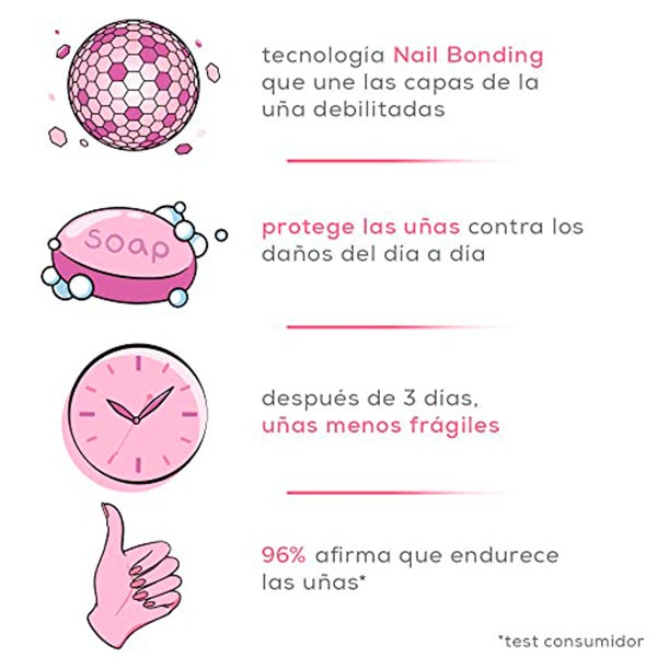 Su tecnología Nail Bonding contribuye a cohesionar la superficie dañada de la uña, reforzándola y disminuyendo su tendencia a quebrarse.