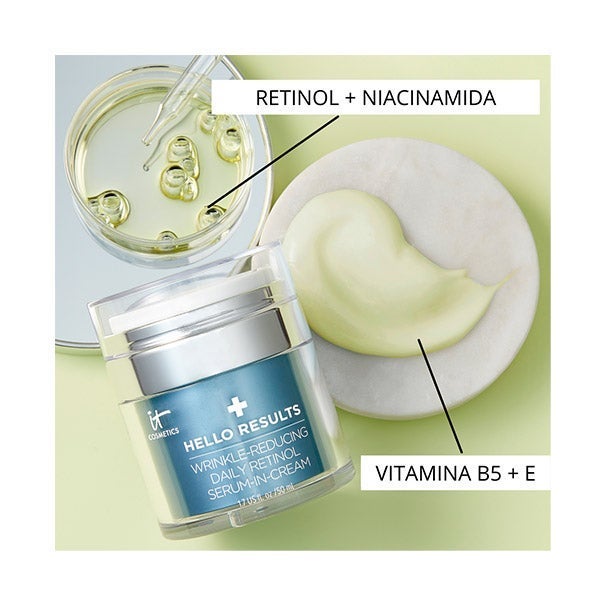 ¿QUÉ ES? IT COSMETICS Hello Results Daily Retinol Serum-in-Cream es un sérum con textura de crema que incorpora retinol para uso cotidiano.