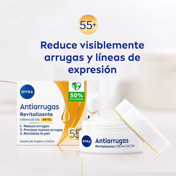 NIVEA Crema de Día Antiarrugas Revitalizante 55+ FP15 es un tratamiento diario que impulsa la energía de la piel madura mientras ayuda a reducir las arrugas desde su origen. Su composición con Aceite de Argán, Calcio y filtros UV contribuye a proteger la piel frente a las arrugas provocadas por la exposición solar.