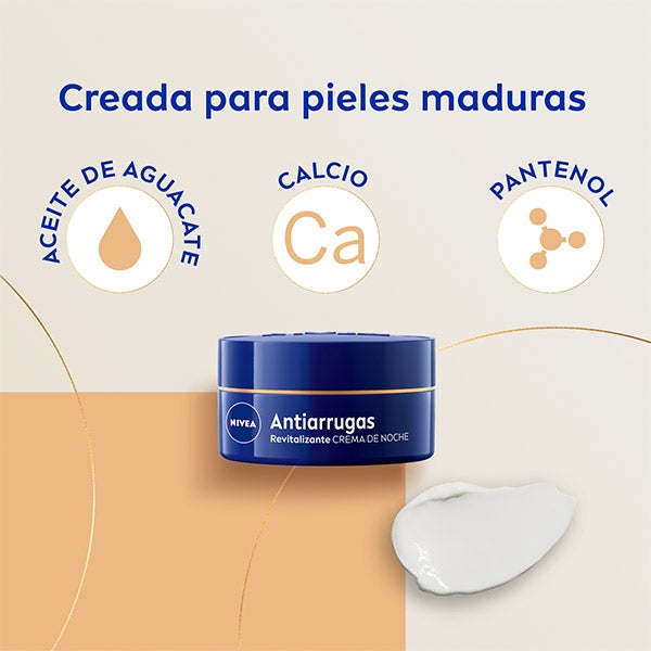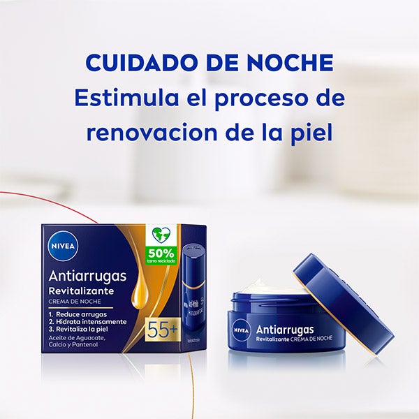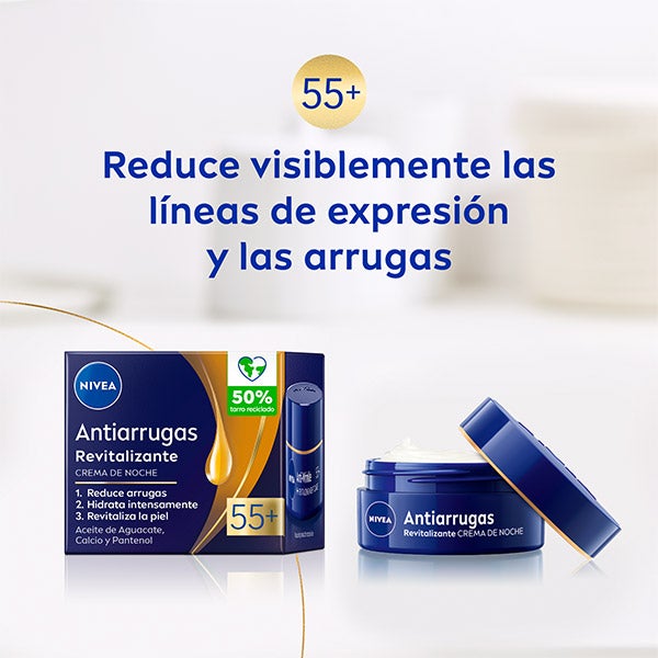 NIVEA Crema de Noche Antiarrugas Revitalizante 55+ es un tratamiento nocturno que ayuda a reactivar la vitalidad y a regenerar la piel madura mientras duermes, actuando sobre las arrugas desde su origen. Su composición con Aceite de Aguacate y Calcio, enriquecida con Pantenol, proporciona una hidratación profunda. Efectos sobre la piel: disminuye líneas y arrugas de manera visible, refuerza la vitalidad de la piel madura y favorece el proceso natural de regeneración durante la noche.