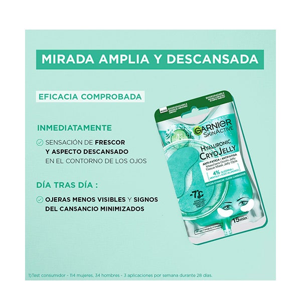 Garnier Tissue Mask Hyaluronic Cryo Jelly Antifatiga para contorno de ojos.