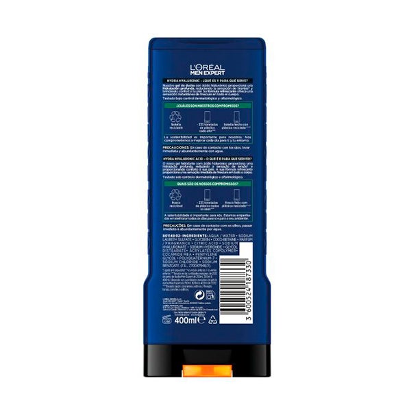 El Gel de Ducha Hydra Hyaluronic de L'Oréal Men Expert combina una fórmula enriquecida con ácido hialurónico, reconocido por su capacidad de mantener la hidratación y aportar mayor confort a la piel.