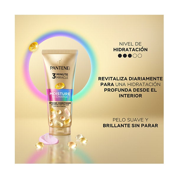 Experimenta el poder del acondicionador intensivo Pantene Hydra Revitaliza 3 Minute Miracle, el tratamiento que revitaliza el cabello muy seco. Formulado con Pro‑Vitamina B5, lípidos nutritivos y antioxidantes protectores, su textura rica y cremosa actúa al instante penetrando en cada hebra y aportando hidratación profunda y nutrientes esenciales. Desde la primera aplicación, el cabello seco se transforma en una melena suave y con un brillo saludable. Explora sus cuatro formas de uso y combínalo con los demás productos de la línea Hydra Revitaliza para crear una rutina capilar completa y reparadora.