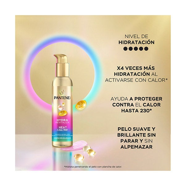 Experimenta la crema sin aclarado Pantene Hydra Revitaliza Heat & Glow, la aliada ideal para el cabello seco o maltratado. Su fórmula PRO-V, que se activa con el calor, libera una mayor concentración de nutrientes hidratantes durante el secado para revitalizar la melena. Contribuye a proteger frente a la humedad, el frizz y las altas temperaturas de hasta 230 °C, dejando el cabello suave, con brillo natural y sin apelmazar. También puede aplicarse en el cabello seco entre lavados para realzar y definir los rizos. Para un resultado óptimo, úsala junto con el resto de la gama Hydra Revitaliza.