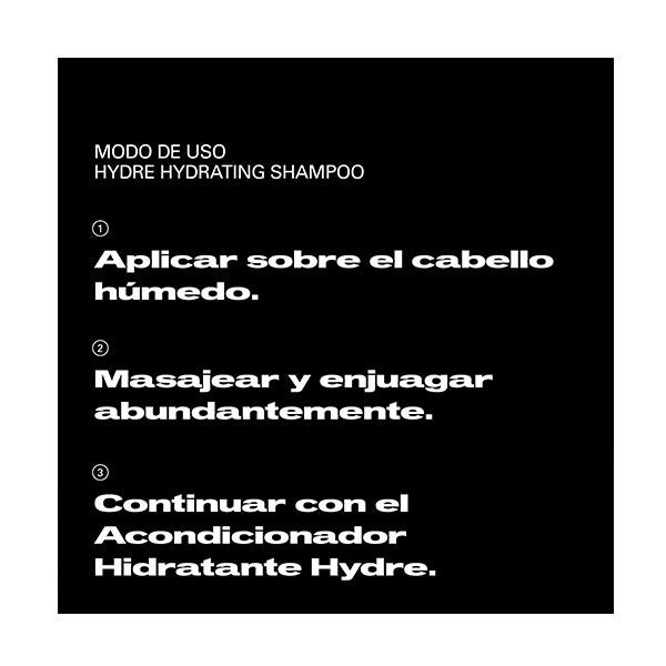Aplicar sobre el cabello mojado, masajear hasta formar espuma, enjuagar y repetir si se desea. Para un resultado más eficaz, continuar con el uso del acondicionador Hydre.