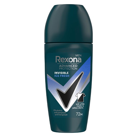 Desodorante antitranspirante en formato roll on para hombres Rexona Invisible Ice, elaborado con tecnología antimanchas y una fórmula sin alcohol (0%).