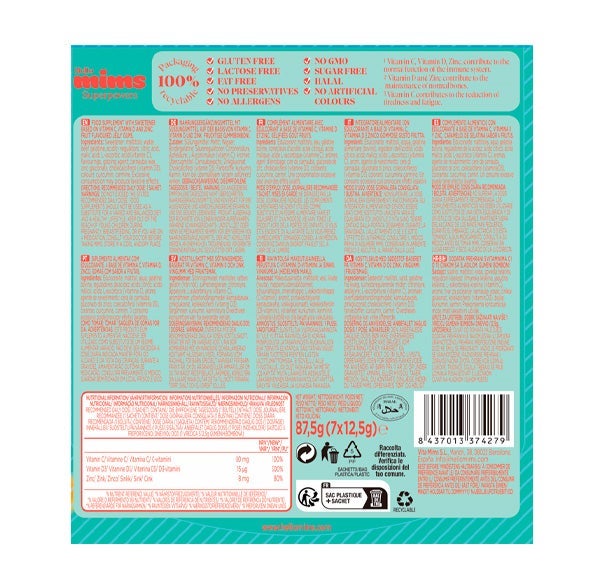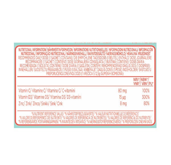Gominolas sin azúcar enriquecidas con vitaminas D, C y Zinc que contribuyen al correcto funcionamiento de las defensas naturales y del sistema inmunitario.
