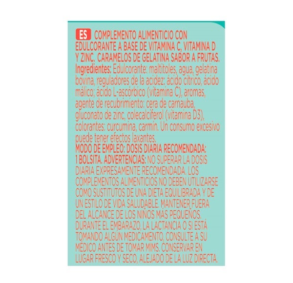 Complemento alimenticio con edulcorante a base de vitamina C, vitamina D y Zinc. Caramelos de gelatina sabor a frutas.
