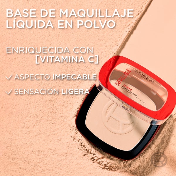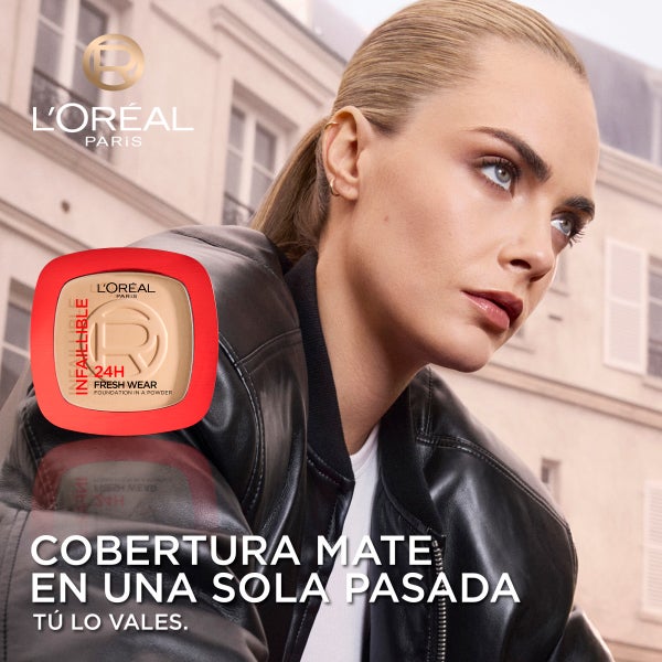 El polvo compacto Infalible de L’Oréal Paris es una base de maquillaje en formato polvo diseñada para pieles de tono medio claro, que aporta un acabado mate uniforme y resiste sin alterarse ante roces, agua, calor o humedad.