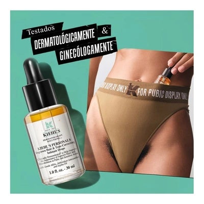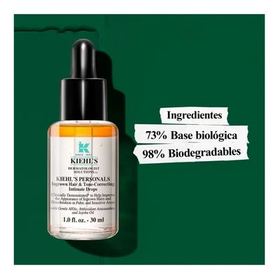KIEHL'S PERSONALS INGROWN HAIR & TONE CORRECTING INTIMATE DROPS es un tratamiento bifásico diseñado para cuidar las zonas donde suelen aparecer vellos encarnados, imperfecciones tras la depilación o diferencias de tono, como las axilas, las áreas externas de las ingles y el pubis, además de brazos, pecho y piernas.