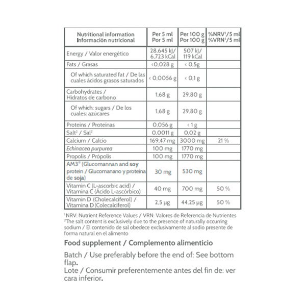 Ingredientes: Agua, Fructosa, Sal cálcica de ácido ortofosfórico, Agente de carga (Glicerina (E-422)), Sulfato cálcico, Echinacea purpurea, Própolis, Vitamina C (Ácido L-ascórbico), AM3® (Glucomanano y Proteína de soja), Acidulante (Ácido cítrico (E-330)), Aroma a naranja, Estabilizante (Goma Xantana (E-415)), Conservador (Sorbato potásico (E-202)), Vitamina D (Colecalciferol).