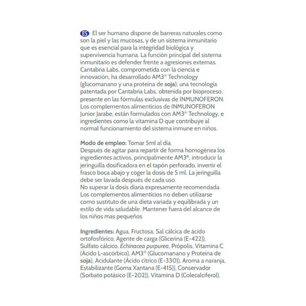 Inmunoferon Junior Jarabe es un preparado especialmente diseñado para niños que incorpora la tecnología AM3 (patente de Cantabria Labs elaborada con glucomanano y proteína de soja), enriquecido con própolis, equinácea, vitamina C y vitamina D. Estos componentes favorecen el adecuado funcionamiento del sistema inmunitario infantil.