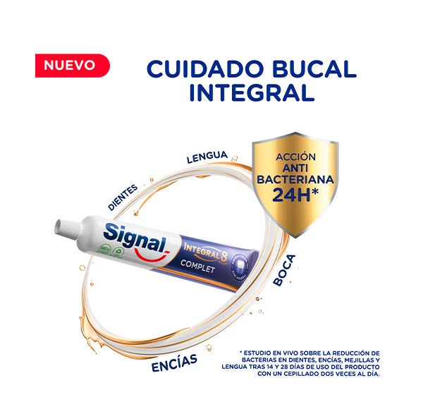 Integral 8 ofrece eficacia prolongada contra la placa bacteriana durante 24 horas*, actuando frente a las bacterias en toda la boca.