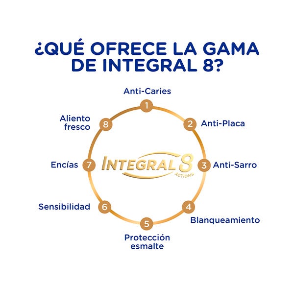 Su fórmula, comprobada clínicamente, proporciona 8 beneficios esenciales: prevención de la caries, acción antiplaca, control del sarro, efecto blanqueador intensificado, protección del esmalte y las encías, cuidado frente a la sensibilidad dental y un aliento fresco.