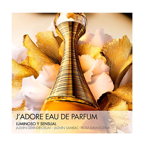La fuerza de un bouquet floral luminoso y singular, realzado por el jazmín de Grasse. J’adore eau de parfum encarna la esencia del gran perfume floral femenino de Dior.