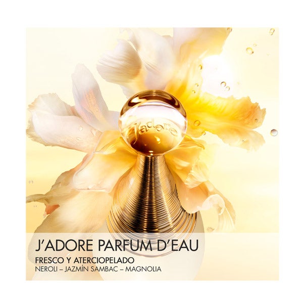 J'adore Parfum d'eau interpreta con fidelidad el icónico bouquet floral de J'adore, liberándose del formato tradicional de notas de salida, corazón y fondo, para ofrecer una percepción inmediata en la que destacan el jazmín sambac, el neroli y la magnolia.