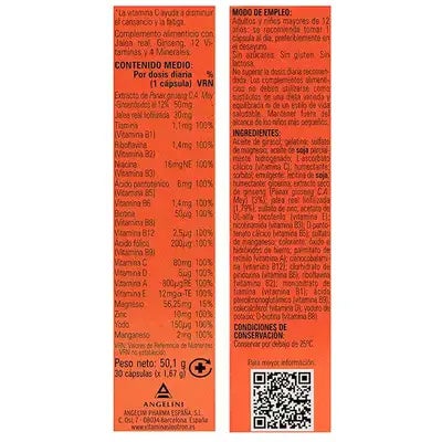 Jalea real, ginseng, vitaminas y minerales 30 cápsulas. diseñado para cubrir las necesidades del día a día.
