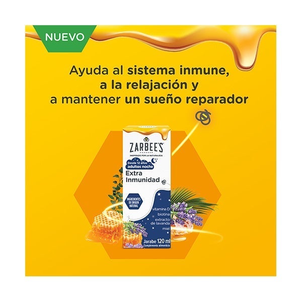El jarabe Zarbee’s Noche Extra Inmunidad combina los beneficios de la miel pura con un aporte de vitaminas que contribuyen al fortalecimiento de las defensas.