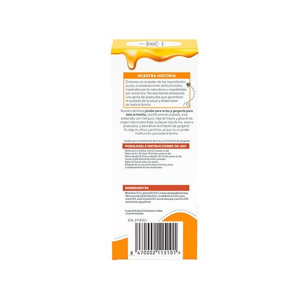 Este jarabe con acción antitusiva y descongestiva incluye miel 100% natural que calma la tos, glicerol que cuida la garganta irritada y extracto de hoja de hiedra que favorece la eliminación del moco y ayuda a mantener las vías respiratorias despejadas.