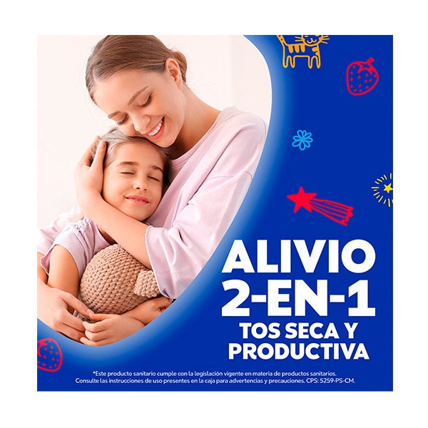 Su fórmula doble acción está pensada para aliviar tanto la tos seca como la productiva, al mismo tiempo que cuida y protege la garganta sensible de los niños.